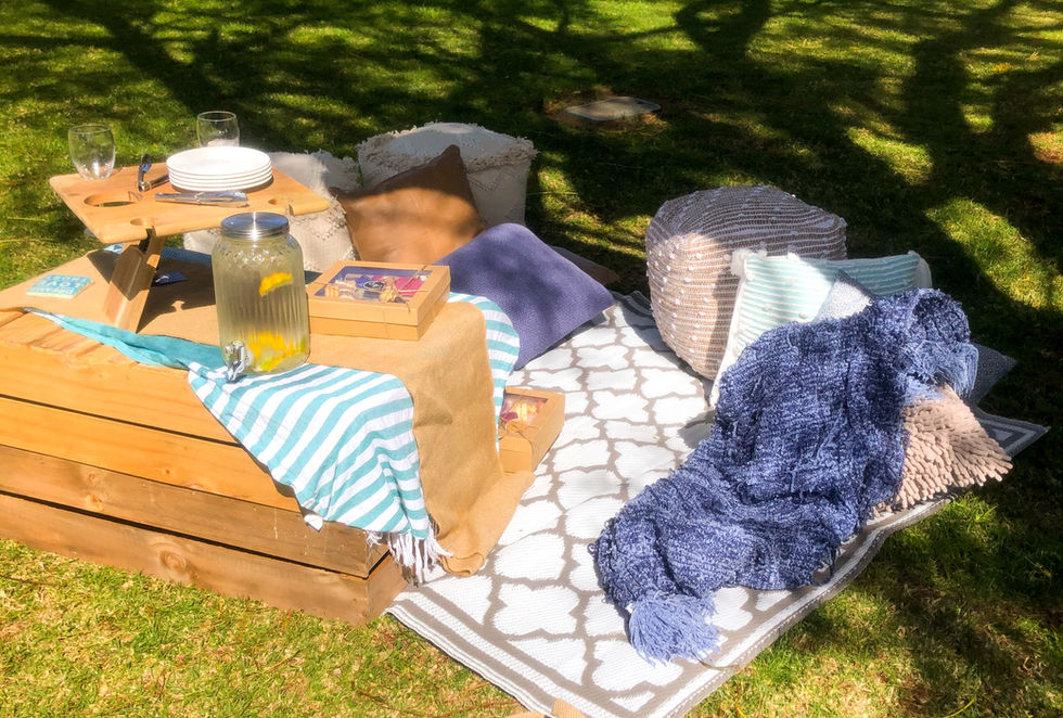 Antipasto picnic loaf, honey & soy chicken pieces, prawn & avocado salad, selection of cheese & crackers